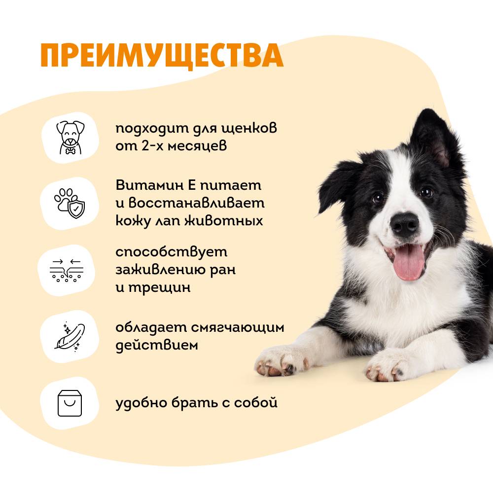 - Витамин Е питает и восстанавливает кожу лап, обеспечивая быстрое заживление мелких ран и трещин.