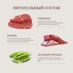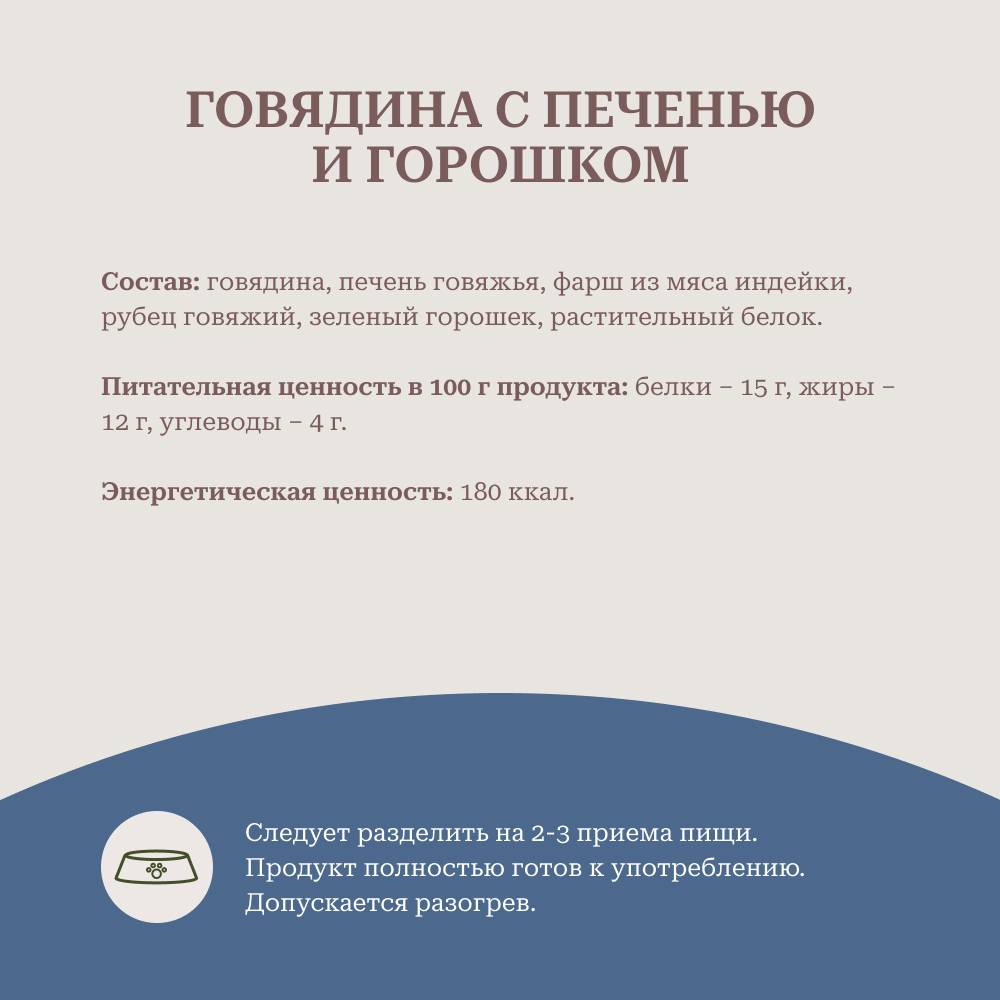 говядина, печень говяжья, фарш из мяса индейки, рубец говяжий, зеленый горошек, растительный белок.