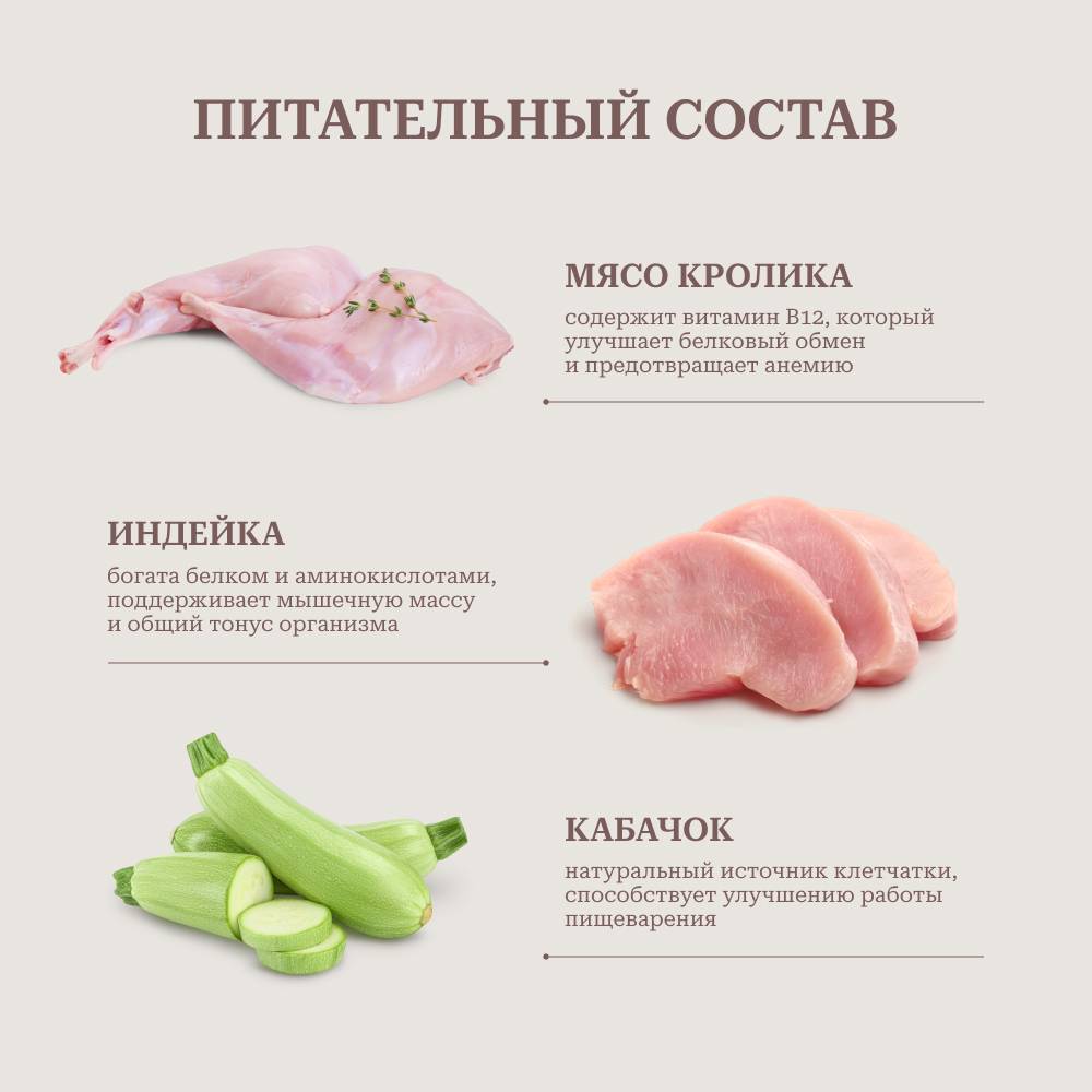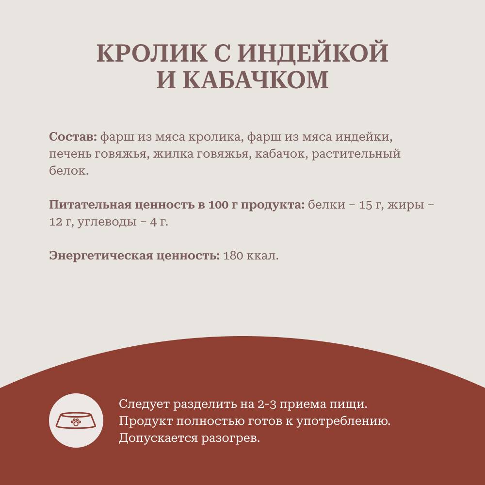фарш из мяса кролика, фарш из мяса индейки, печень говяжья, жилка говяжья, кабачок, растительный белок.