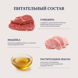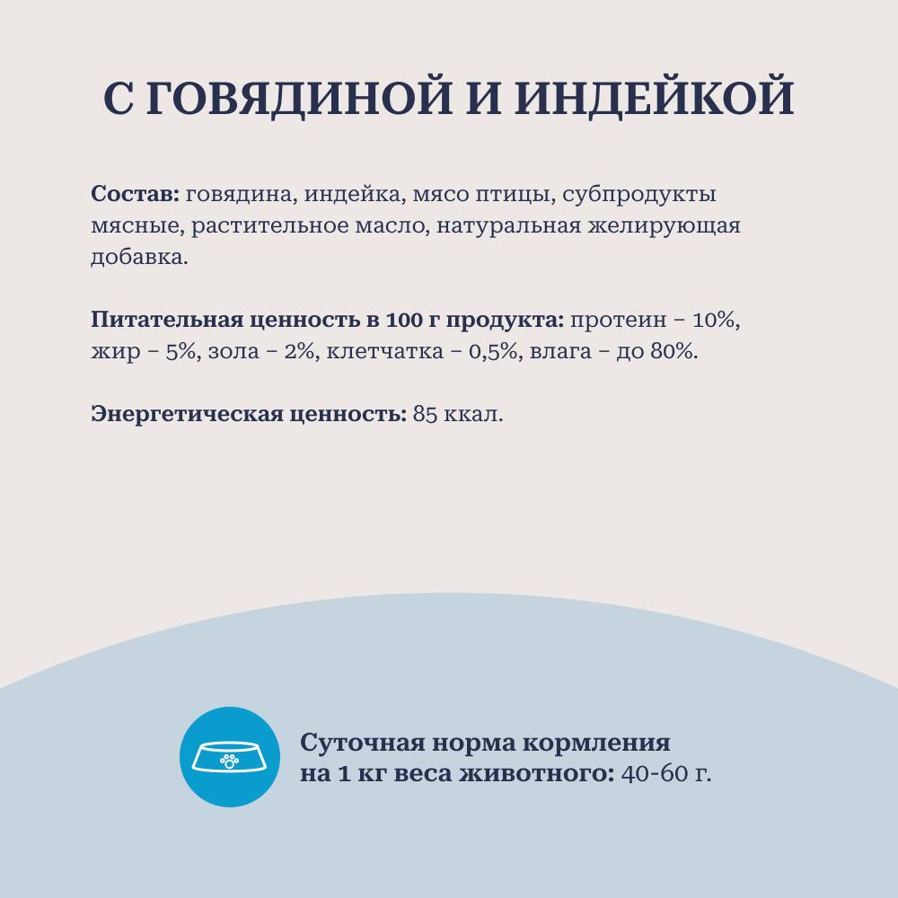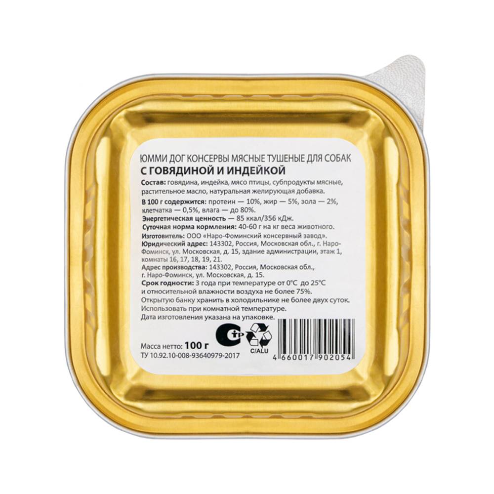 Консервированный корм «YUMMY» для собак «Говядина с индейкой» изготовлен по классической рецептуре. Помимо основного ингредиента – мяса, корм содержит мясопродукты и субпродукты, обогащающие его питательными веществами и витаминами, и придающие корму аппетитный для питомца вкус и аромат.