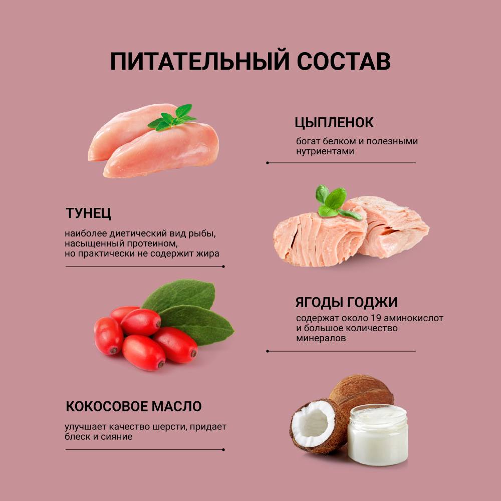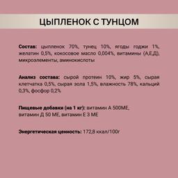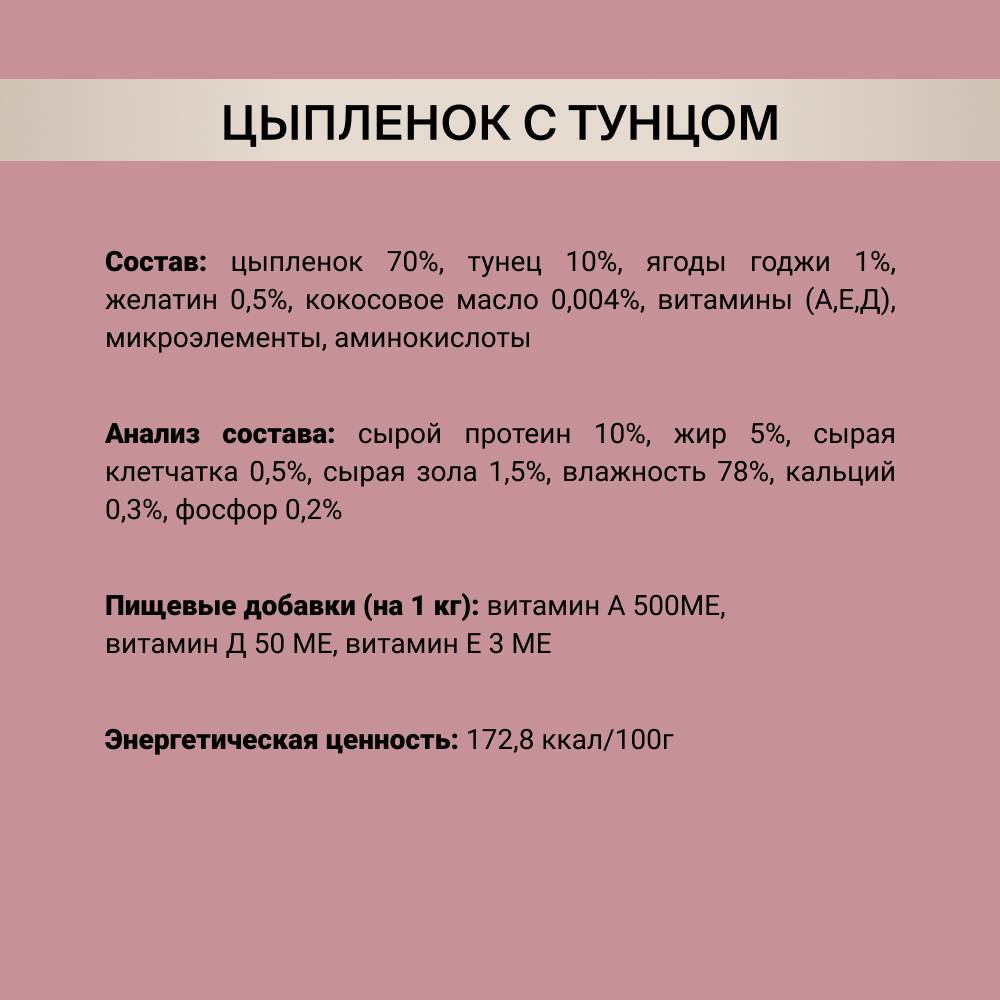 Мясной деликатес для взрослых кошек Цыпленок с тунцом создан специально для животных, чувствительных к синтетическим добавкам.