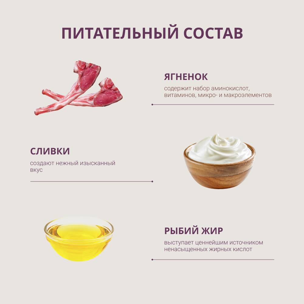 ягненок (50%), курица 10%, вода, масло растительное, сливки, комплексная пищевая добавка (загустители и стабилизаторы, декстроза), клюква, черника, мука пшеничная, рыбий жир, таурин.