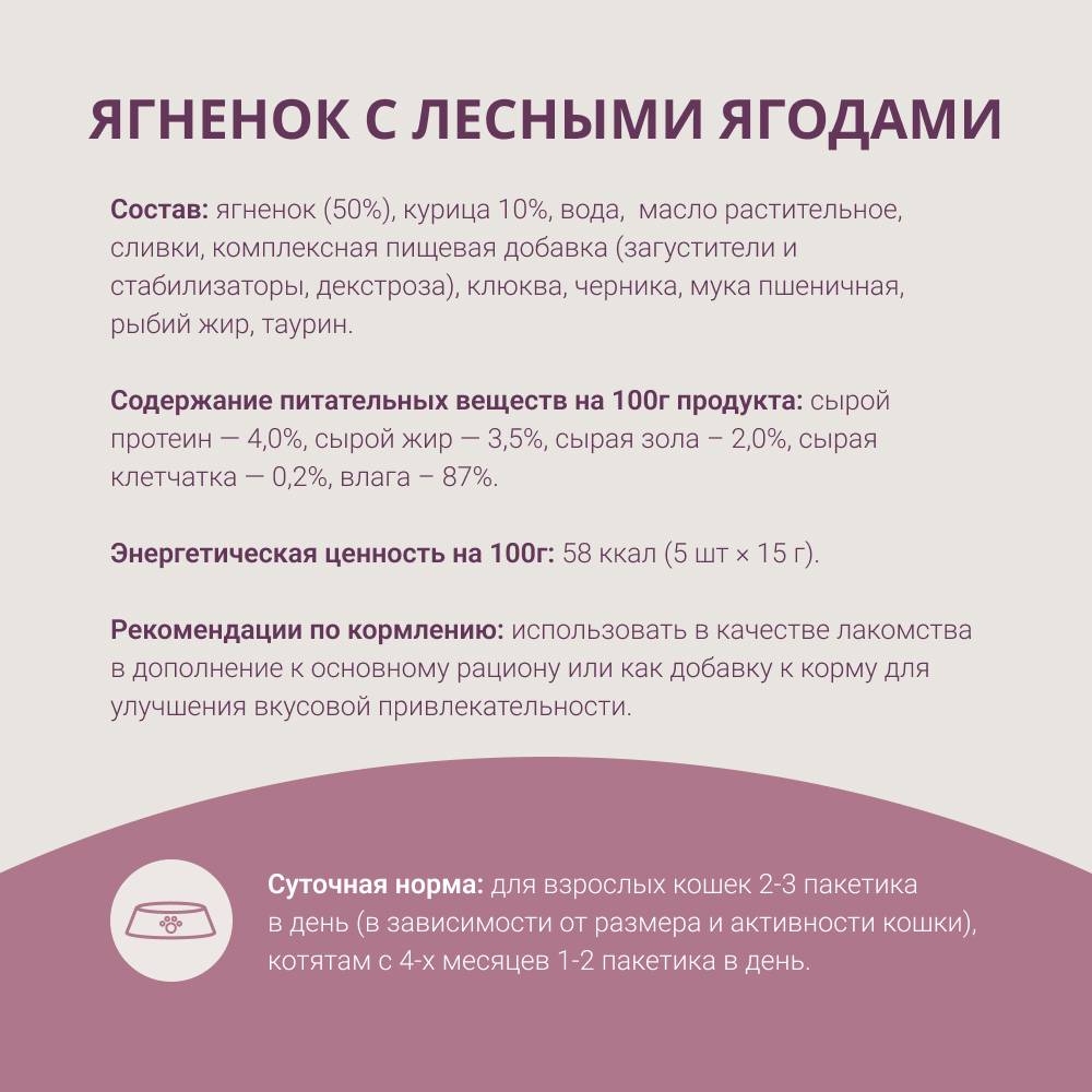 Суточная норма: для взрослых кошек 2-3 пакетика в день (в зависимости от размера и активности кошки), котятам с 4-х месяцев 1-2 пакетика в день. Лакомство подавать комнатной температуры.