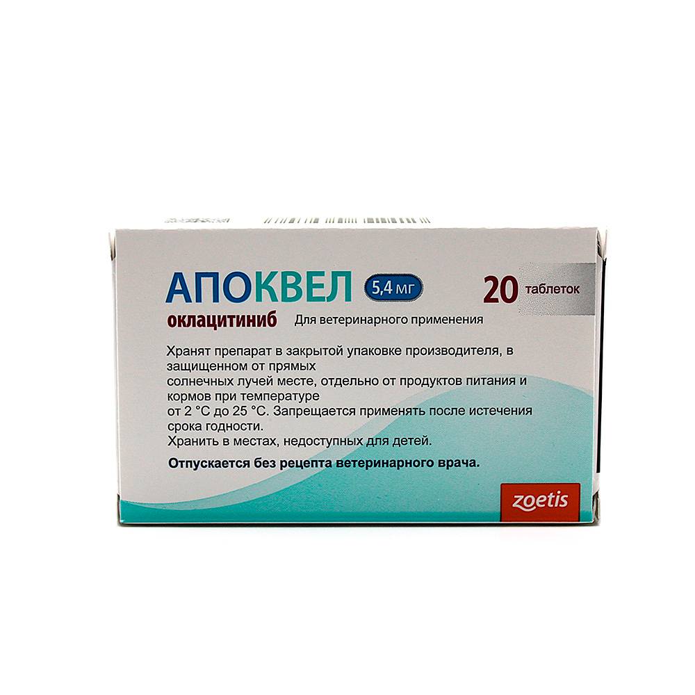 Апоквел в таблетках для собак для контроля симптомов зуда и воспаления кожи при дерматите, ассоциированном с аллергией (контактной, пищевой, паразитарной), а также для лечения и профилактики рецидивов атопического дерматита.