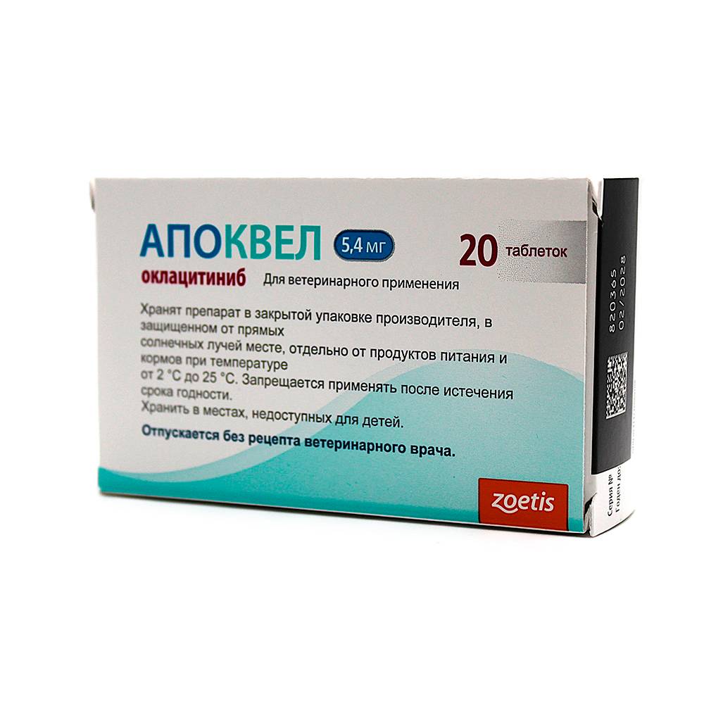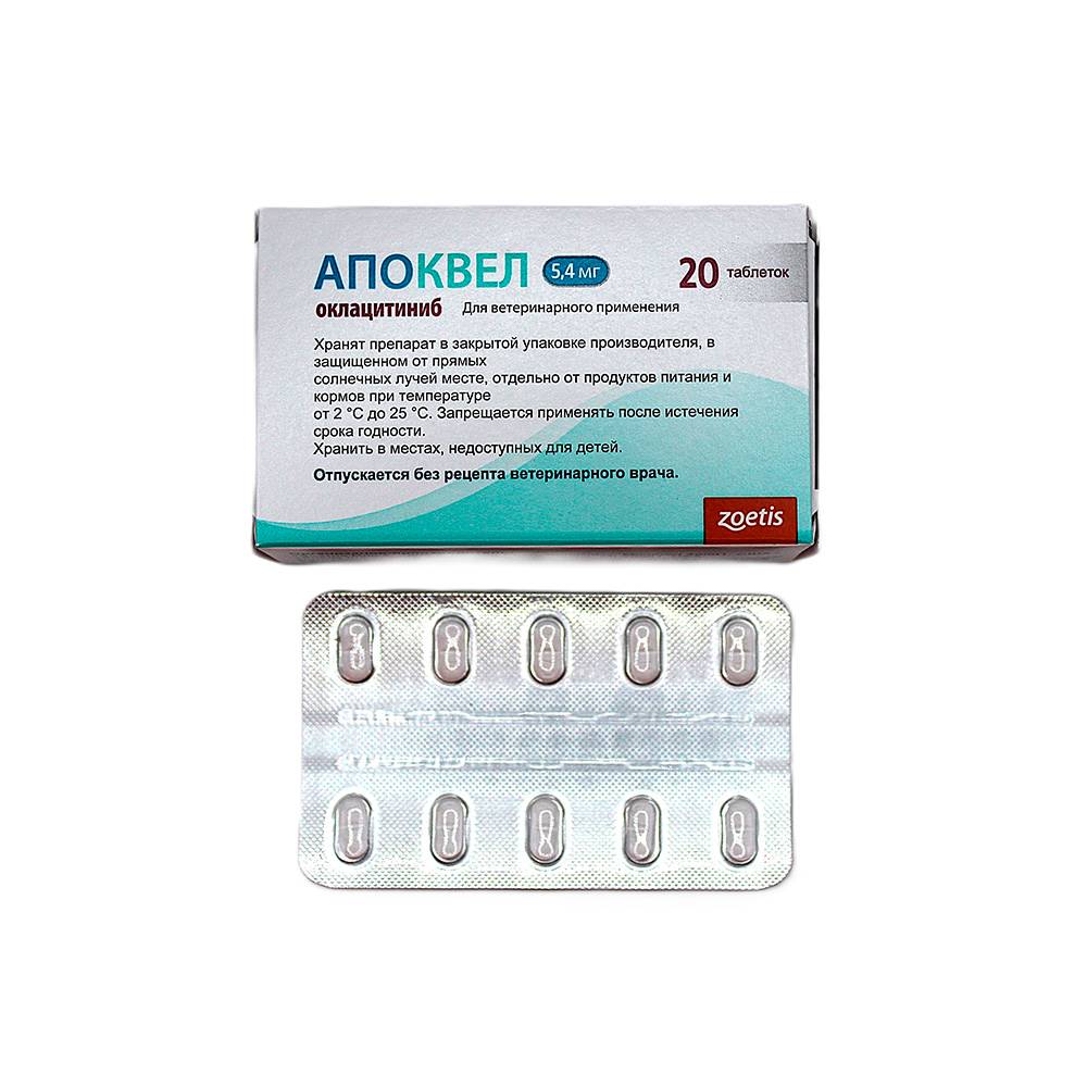 Апоквел в таблетках для собак для контроля симптомов зуда и воспаления кожи при дерматите, ассоциированном с аллергией (контактной, пищевой, паразитарной), а также для лечения и профилактики рецидивов атопического дерматита.