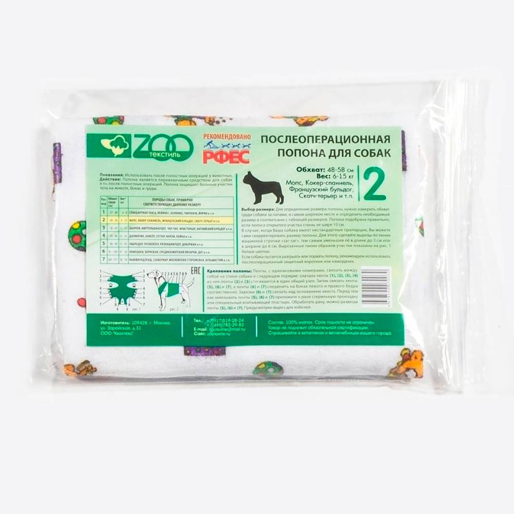 Послеоперационная попона для животных способствует быстрому заживлению послеоперационных ран, является защитой от разлизывания раны животным и препятствует загрязнению шва. Крепится на шее, на спине и за хвостом с помощью завязок, которые обеспечивают надежное крепление.
